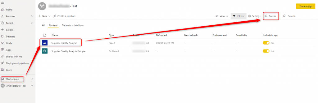 - Dai Workspaces è stato selezionato il report che si desidera collegare all’applicazione e premuto il tasto Access.