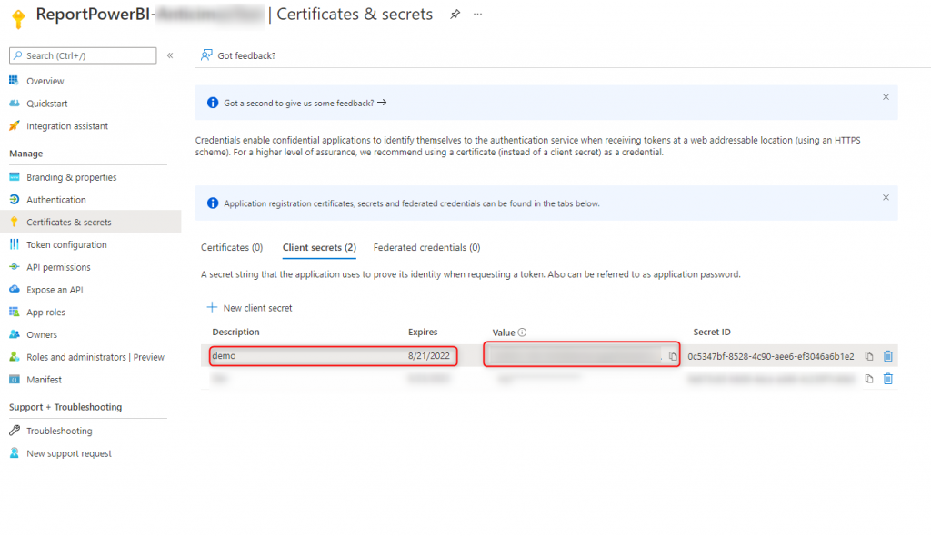 - È stata creata una nuova registrazione associata all’app. Da qui è stato dunque creato un nuovo client secret, che in combinazione al tenant id e client id consentirà all’applicazione Blazor di autenticarsi.