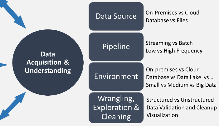 La prima cosa da fare avendo a disposizione dei Big Data utili per il nostro progetto di apprendimento automatico è la loro acquisizione e comprensione, appunto il secondo passo del processo TSPD come ad esempio descritto da Microsoft per la propria piattaforma Azure Machine Learning. Gli obiettivi di questa fase dell’analisi scientifica dei dati sono: