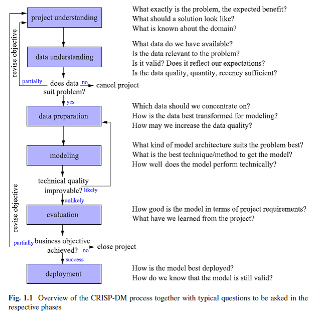 Nella figura a fianco, tratta da “Guide to Intelligent Data Analysis - How to Intelligently Make Sense of Real Data”, di Berthold et al edito da Springer, le diverse fasi del metodo sono accompagnate dalle domande chiave a cui si deve rispondere per poter procedere oltre.