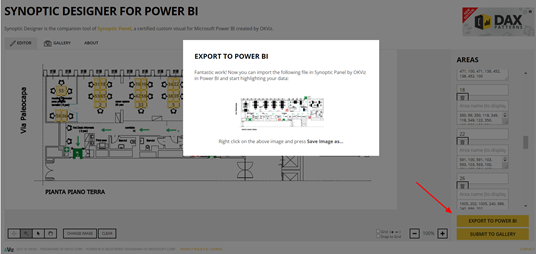 Ultimate le postazioni e la customizzazione della piantina, puoi procedere all’esportazione della stessa. Cliccando su Export to Power BI e scaricando l’elaborato, lo strumento genererà un file SVG, unico formato “leggibile” dal visual Synoptic Panel su Power BI.