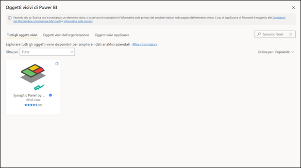 Per scaricarlo guarda nel pannello laterale “Visualizzazioni”, clicca sui tre puntini e poi su “Ottieni altri oggetti visivi”.