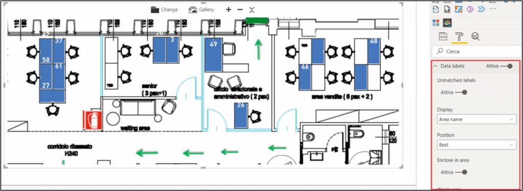 - Category e Subcategory: é il campo descrittivo delle aree ed è necessario che uno dei due sia associato al paramento inserito su Synoptic Designer. Nel caso della planimetria di HUDI al campo Category è stato assegnato l’indice della postazione, mentre la Subcategory è popolata al Campo BU. Di seguito mostriamo come l’inserimento di entrambi i campi modifichi il grado di interazione della planimetria.