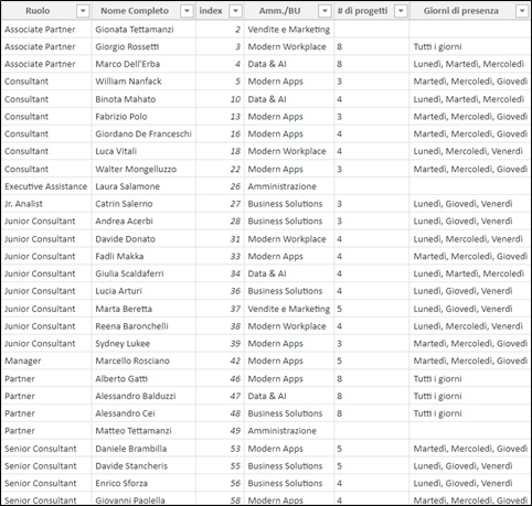 - Amm./BU: allocazione del singolo dipendente, distinta in Amministrazione, Vendite e Marketing, Modern Workplace, Data & AI, Modern Apps e Business Solutions;