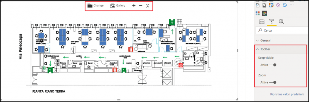 - Toolbar à è relativo alle modifiche apportabili al toolbar del visual. Come si nota da immagine sottostante, flaggando la voce “Keep visible” è possibile integrare il toolbar all’interno del visual, mentre l’attivazione del campo “Zoom” ti dà la possibilità di zoomare o meno la planimetria inserita.